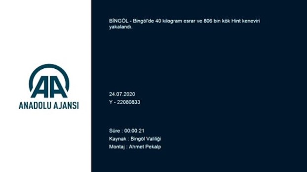 - Esrar tarlalarının drone ile görüntülenmesiBİNGÖL (AA) - Bingöl 'de 40 kilogram esrar ve 806 bin kök Hint keneviri yakalandı.Valilikten yapılan açıklamaya göre, İl Jandarma Komutanlığınca Genç ilçesi kırsalında yasa dışı kenevir ekildiği, kenevir tarlalarından esrar elde edilerek piyasaya sürüleceği, uyuşturucu satışından elde edilen gelir ile terör örgütüne finans sağlanacağı bilgisine ulaşıldı.Bunun üzerine ilçe kırsalında düzenlenen operasyonda 40 kilogram esrar ve 806 bin kök Hint keneviri bulundu, bir şüpheli hakkında işlem yapıldı.Kenevirler tarlalardan sökülerek, imha edildi. UyuşturucuAkalanTerör Örgütü