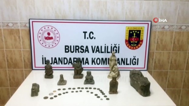 - Bursa İl Jandarma Komutanlığı, çok sayıda tarihi eser ele geçirirken, 4 kişiyi gözaltına aldı. Edinilen bilgiye göre, Eskişehir'de yaşayan Ş.E. elindeki yaklaşık 1500 yıllık ve 1 milyon dolar değerinde olduğunu iddia ettiği insan figürlü heykel ve sikkeleri Bursa'da satmaya çalıştı. İhbar üzerine harekete geçen Bursa İl Jandarma Komutanlığı, İnegöl'ün Yeniceköy Mahallesi'nde düzenlediği operasyonda H.K, S.P, A.A ve Ş.E'yi gözaltına aldı. Şahıslarla birlikte 1 adet Roma, 4 adet Helenistik, 3 adet Frigya devirlerine ait olduğu değerlendirilen heykel ile 1 adet altın kolye ucu, 2 adet altın sikke, 1 adet gümüş sikke ile 26 adet çeşitli dönemlere ait sikke ele geçirildi. Zanlılar hakkında 2863 sayılı kanuna muhalefet suçundan işlem yapıldı.