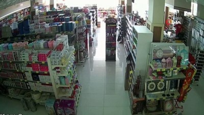 ( DENİZLİ )- Deprem anı marketin güvenlik kameralarına yansıdı- Depremde raflar sallandı, ürünler yere böyle devrildi DENİZLİ