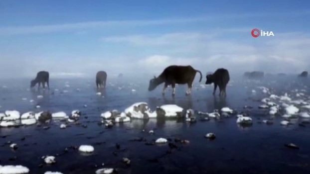 - Van’ın Çaldıran ilçesine bağlı bazı mahalle sakinleri, dondurucu soğuklara rağmen mandalarını Kaz Gölü’ndeki taze otlarla besliyor. Türkiye’nin en soğuk yerleşim yerlerinden biri olan ve kış mevsiminin en çetin geçtiği Çaldıran ilçesinde, hava sıcaklığı geçmiş yıllarda 45 dereceyi dahi görmüştü. Etkisini gösteren soğuk hava nedeniyle hayat durma noktasına gelirken, mandalar ise Kaz Gölü Çayı içerisindeki taze otla besleniyor. Sabah sahipleri tarafından suya getirilen ve bölgede önemli bir geçim kaynağı olan mandalar, akşam ise kendileri ahırların yolu tutuyor. Oruçlu Mahallesi’nde ikamet eden Yaşar Beyazsu, 50 haneli mahalledeki 30 hanenin manda beslediğini belirtti.