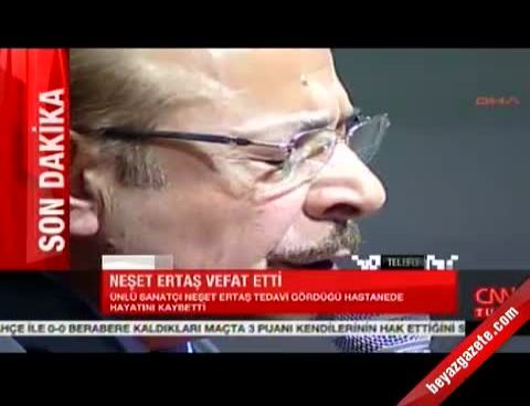 İzmir'de önceki hafta hastaneye kaldırılan Türk Halk Müziği bestecisi, söz yazarı ve yorumcusu Neşet Ertaş'ın, ' primer hastalığı nedeniyle durumunun biraz daha ağırlaşması yüzünden yoğun bakım servisine kaldırıldığı ' bildirilmişti. Ertaş sabah saatlerinde hayata veda etti.