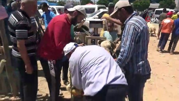 - Kurban Bayramı'na sayılı saatler kala Gaziantep'teki hayvan pazarlarında yoğunluk yaşanıyor. Kurbanlık almayan vatandaşlar kurban pazarlarına akın ederken, kurban almak isteyen vatandaşlar ile besiciler arasındaki sıkı pazarlık dikkat çekiyor. Yoğunluğun yaşandığı Gaziantep'teki hayvan pazarlarında büyükbaş ve küçükbaş hayvanlar alıcılarını beklerken, pazar yerinde ve çevresinde yoğun araç trafiği yaşanıyor. Sabahın erken saatlerinden itibaren kalabalıklaşmaya başlayan pazarlarda kurban almak isteyen vatandaşlar ile besiciler arasındaki sıkı pazarlık sonucu ise ortaya renkli görüntüler çıkıyor. Pazara gelen vatandaşlar son gün olması nedeniyle uygun fiyata kurbanlık almayı hedeflerken, besiciler ise ellerindeki kurbanlıkları bitirmeye çalışıyor. Aşırı sıcaklar vatandaşları ve kurbanlıkları olumsuz etkiliyor Gaziantep'teki aşırı sıcaklar kurban alışverişini de olumsuz etkilerken pazardaki vatandaşlar ve kurbanlıklar zor anlar yaşıyor. Kentte sıcaklık nedeniyle kurban pazarlarındaki yoğunluğun havanın serinlediği akşam saatlerine doğru had safhaya ulaşması bekleniyor.