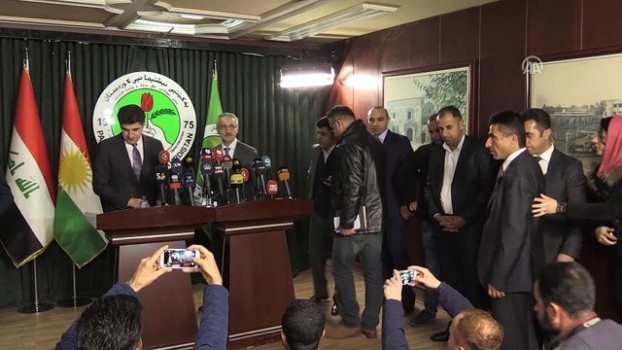 Süleymaniye kentindeki Kürdistan Yurtseverler Birliği (KYB) Politbüroyu ziyaret eden Barzani, KYB Politbüro Sorumlusu Mela Bahtiyar ile ortak basın toplantısı düzenledi.