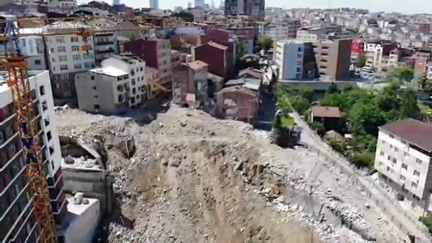 - Kağıthane’de yıkım kararı verilen 24 binadan 14’ünün iş makineleriyle yıkımını tamamlanmasının ardından çalışmalardaki son durum havadan görüntülendi. Kağıthane Yahya Kemal Mahallesi Akıncı Sokak üzerinde inşaat alanındaki kazı çalışmaları sonucunda önce istinat duvarı ardından da bir bina çökmüştü. Ölen ya da yaralananın olmadığı olayda büyük panik yaşanmıştı. Olayın ardından yetkililerin incelemesi sonucunda çökmek üzere olan bir bina da iş makineleriyle kontrollü bir şekilde yıkılmıştı. Olay nedeniyle semtteki 24 bina boşaltılmış, bir süre sonra vatandaşların kısa bir süreliğine eşyalarını almasına izin verilmişti. Son durum havadan görüntülendi Çalışmaların ardından geçtiğimiz hafta yıkım kararı verilen 24 binadan 14’ü iş makineleriyle yıkılmıştı. Geriye kalan 10 binanın ise peyderpey yıkımı sürüyor. Alanda oluşan enkaz hafriyat kamyonlarıyla taşınıyor. İş makineleri tarafından delinen binalar ise yıkılmayı bekliyor. Düzenli aralıklarla devam eden yıkım çalışmaları havadan görüntülendi.