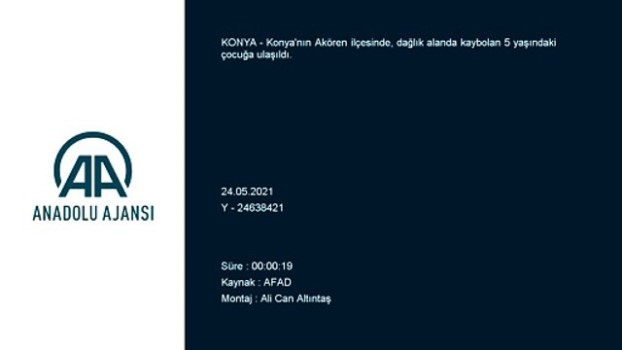 - Kaybolan çocuğun AFAD ekipleri tarafından kurtarılması Konya 'da dağlık alanda kaybolan çocuk bulunduKONYA (AA) - Konya 'nın Akören ilçesinde, dağlık alanda kaybolan 5 yaşındaki çocuğa ulaşıldı.Avdan Mahallesi'ndeki dağlık alanda 5 yaşındaki Muhammed Yılmaz'ı çardakta bulamayan ailesi, bir süre çocuklarını aradı.İhbar üzerine harekete geçen Afet ve Acil Durum Yönetimi Başkanlığı (AFAD) ile jandarma ekipleri, Yılmaz'ın en son görüldüğü alanda arama çalışması başlattı.Ekiplerin yoğun çalışması sonucu yaklaşık 3 - 4 saat sonra bulunan Yılmaz'ın susuzluk ve açlıktan halsiz düştüğü görüldü. Minik Muhammed Yılmaz, sağlık kontrollerinin ardından ailesine teslim edildi. JandarmaHarekete GeçTrol