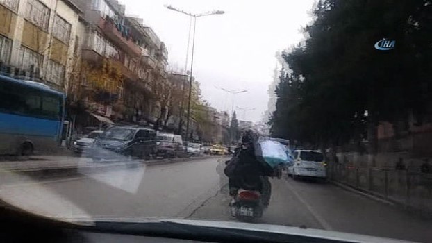 - Gaziantep'te bir motosikletli sürücünün tehlikeli yolculuğu cep telefonu ile kaydedildi. Gaziantep'te Şahinbey ilçesi Özdemirbey Caddesi Düztepe mahallesinde 3'ü çocuk 5 kişilik ailenin tehlikeli motosiklet yolculuğu cep telefonuyla kaydedildi. İkazlara rağmen sürücünün önünde 2 çocuğu yer alırken arkasında bulunan eşi ve kucağında bebeğin bulunması görenleri şaşırttı. Yolcuların kask takmadığı görülürken, tehlikeli yolculuk trafikteki başka araçların sürücüleri tarafından cep telefonu ile kaydedildi. Bir süre devam eden yolculukta motosikletli sürücü ara sokaklara girerek, izini kaybettirdi (SD-