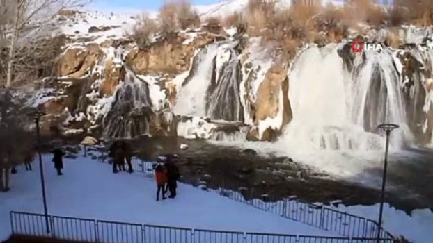 - Van’ın Muradiye ilçesinde bulunan ve her mevsim ayrı güzelliğiyle ziyaretçilerini kendine hayran bırakan Muradiye Şelalesi kısmen dondu. Hava sıcaklığının zaman zaman sıfırın altında 10 dereceye kadar düşmesi, yaz aylarında coşkulu akan suyuyla dikkat çeken Muradiye Şelalesi’nin bir bölümünü buza çevirdi. Yaklaşık 20 metre yükseklikten akan şelalenin buzla kaplı görüntüsü, seyrine doyumsuz görüntüler oluşturdu. Yılın her döneminde büründüğü farklı güzelliklerle ziyaretçilerini kendisini hayran bıraktıran Muradiye Şelalesi, yabancı turistlerin de ilgi odağı oluyor. Kısmen donan şelaleyi ziyaret eden Malik Hacıoğlu isimli vatandaş, her mevsim şelalenin ayrı bir güzelliğe büründüğünü belirterek, “Bizim ve buraya gelen vatandaşların huzur bulduğu bir yer. Turizm yönünden Muradiye Şelalesi insanları cezp ediyor. Her mevsim buradan yapılan bir haber veya bir paylaşım, yerli ve yabancı turistlerin gelmesine sebep oluyor, bu da bizi mutlu ediyor. İnşallah şelalemiz yeni çevresiyle ilkbahardan itibaren daha da güzel olacak” dedi.