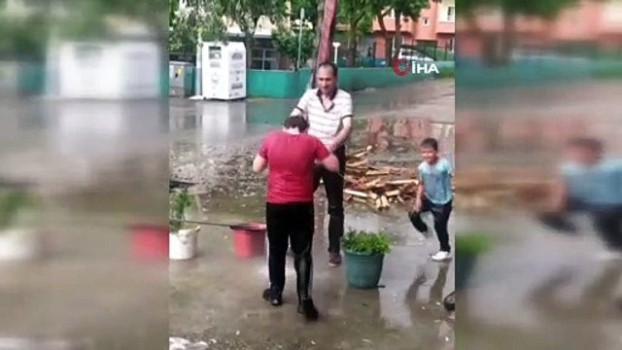 ( BURSA )- Bursa'da sağnak yağmurda bir babanın iki oğluna saçak altında duş aldırdığı görüntüler sosyal medyayı salladı BURSA