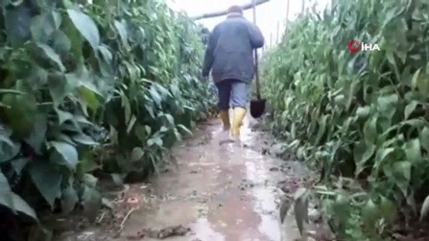 - Antalya’da etkili olan yağış nedeniyle örtü altı tarım yapılan bazı çilek ve biber seralarını su bastı. Bir derenin taşması sonucu 10 mahallenin ulaşımı aksadı.Antalya'da dün gece yarısını başlayan aşırı yağışlar Serik ilçesinde örtü altı tarım yapılan seralarda zarara neden oldu. Kökez Mahallesi Yazır mevkisindeki dere de sağanak nedeniyle taştı. Yaklaşık 10 mahalleyi birbirine bağlayan yol sular altında kaldı. Derenin yakınında içinde biber bulunan iki cam serada sular altında kaldı."Elinde kürekle serasına koştu"Elinde kürekle serasına giren sel sularını tahliye etmeye çalışan Süleyman Cengiz, “ İçinde biber ekili olan serama en küçük yağmurda su giriyor. Bunun nedeni de yakındaki derenin ıslah edilmemesidir. En küçük yağmur dere sele dönüyor. 1 dönümün üzerinde alanımın su içinde kaldı. 25-30 santimetre sera içinde su var. Bu mahsulün ölümü demek artık.”dedi.