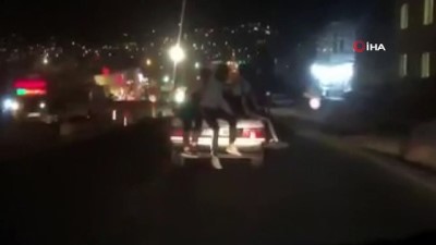 Seyir halindeki otomobilin bagajına oturan 3 kişi canlarını hiçe saydı