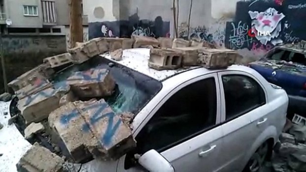 Şiddetli rüzgar nedeniyle duvar araçların üzerine devrildi