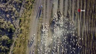 Koyun sürülerinin tozlu yol ve vadilerden geçişiyle beraber ortaya çıkan görüntüler havadan drone ile görüntülendi. (ÖO-MSA-Y)