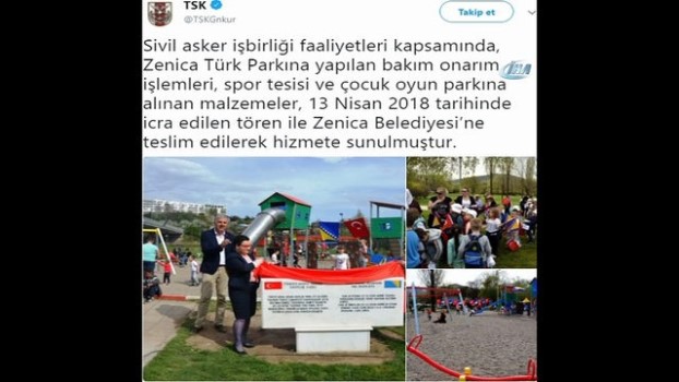 - Türk Silahlı Kuvvetleri (TSK), Bosna-Hersek'teki Zenica Türk Parkının bakım ve onarımını yaparken, parka oyun malzemeleri aldı. TSK'nın sosyal paylaşım sitesi Twitter'de yapılan paylaşımda, "Sivil-asker işbirliği faaliyetleri kapsamında, Zenica Türk Parkına yapılan bakım onarım işlemleri, spor tesisi ve çocuk oyun parkına alınan malzemeler, 13 Nisan 2018 tarihinde icra edilen tören ile Zenica Belediyesine teslim edilerek hizmete sunulmuştur" denildi.