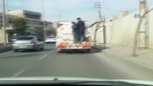 - Şanlıurfa’da yakıt tankerine tutunan 2 gencin tehlikeli yolculuğu kameralara yansıdı. Edinilen bilgiye göre, Şanlıurfa’nın Eyyübiye ilçesinde seyir halindeki yakıt tankerine tutunan 2 gencin tehlikeli yolculuğu görenleri yüreklerini ağızlara getirdi. Akçakale yolu üzerinde seyir halinde olan yakıt tankerinin arkasına tutunarak yolculuk eden 2 genci gören bir sürücü bu tehlikeli yolculuğu cep telefonuyla kaydetti.