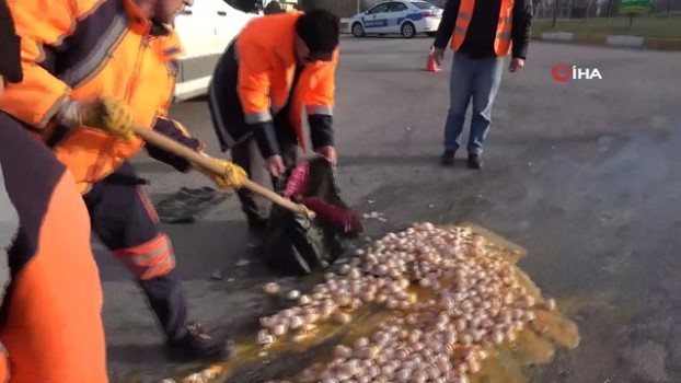 - Tokat’ta, kavşakta bir kamyonetten yola döküldüğü tahmin edilen kolilerce yumurta kazaya sebep olmaması için belediye ekipleri tarafından temizlendi. Edinilen bilgiye göre; Tokat-Turhal Karayolu çevre yolu girişinde bir kamyonetin açılan arka kapağından yola kolilerle yumurta döküldü. Sürücü yumurta kolilerin düştüğünden habersiz yoluna devam ederken, yola saçılan yumurtalar trafikte aksamalara neden oldu. Olay yerine gelen trafik ekipleri olası bir kazaya karşı güvenlik önlemi aldı. Belediye temizlik ekipleri ve karayolları ekipleri birlikte yolda temizlik çalışması yaptı. Yola dökülerek kırılan yüzlerce yumurta çöp poşetlerine küreklerle doldurularak kaldırıldı. Havanın soğuk olması nedeniyle yolda suyla temizleme yapılamazken, toprak dökülerek yoldaki kayganlık giderildi. Belediye temizlik ekibi çavuşu Mehmet Çınar, kavşakta dönüş yaparken bir araçtan yola yumurta döküldüğünü tahmin ettiklerini, kaza yaşanmaması için temizlik çalışması yaptıklarını söyledi.