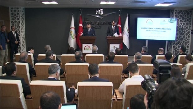 ( ANKARA ) Tarım ve Orman Bakanı Bekir Pakdemirli: "Devlet artık vatandaşıyla malını mülkünü paylaşıyor"- Bakan Pakdemirli: " Türkiye'deki arazilerin %5'ine denk gelen bir iş yapmış oluyoruz"- Bakan Pakdemirli: "Hazineye ait izinsiz, sözleşmesiz kullanılan bu tarım arazileri kayıt altına alınmış olacak" - Çevre ve Şehircilik Bakanı Murat Kurum: "Tarım arazilerini çiftçilerimize doğrudan ecrimisil bedelinin yarısı üzerinden 10 yıla kadar kiralanmasını sağlayacağız"- Bakan Kurum:" Kiralama yapılabilmesi için 31 Aralık 2017'den önce bu arazilerin 3 yıl süreyle kullanılmış olması gerekiyor"- Bakan Kurum: "Mevcuttaki ecrimisil bedelinin yarısı üzerinden kiralama yapılacak. Çiftçiler, kiranın %25'ini peşin kalanını da 2 taksitle ödeyebilecek"- Bakan Kurum: "Çiftçiler arzu ederlerse kira bedelini uzatabildiğimiz gibi bu arazileri doğrudan kendilerine satabileceğiz" ANKARA