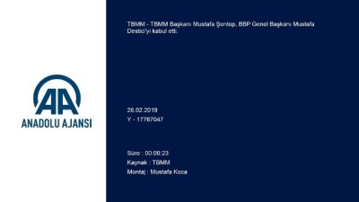 - BBP Genel Başkanı Mustafa Destici'nin gelişi - TBMM Başkanı Mustafa Şentop'un Destici'yi karşılaması - Görüşmeden detaylarTBMM - TBMM Başkanı Mustafa Şentop, BBP Genel Başkanı Mustafa Destici'yi kabul etti.