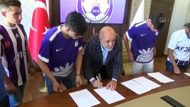 - İmza töreninden görüntüler - Kulüp başkanı Salih Sel'in konuşması AFYONKARAHİSAR (AA) - Spor Toto 1. Lig'in yeni ekiplerinden Afjet Afyonspor'da altyapıdan yetişen 4 futbolcuyla profesyonel sözleşme imzalandı.Mor - beyazlı kulüp, altyapıdan Hasan Kutlu (18), Zeki Sevimgin (18), Furkan Şahin (16) ve Furkan Özen (17) ile 2 yıllık profesyonel sözleşme imzaladı.Aynı zamanda Afyonkarahisar İl Genel Meclisi Başkanı da olan kulüp başkanı Salih Sel, makamında gerçekleştirilen imza töreninde yaptığı konuşmada, futbolun daha da ileri gidebilmesi için mutlaka altyapılara büyük önem verilmesi gerektiğini belirterek, şunları kaydetti:"Örnek olmak için yola çıktık. İkinci hedef olarak '10 yıl içinde Süper Lig'e çıkacağız.' dedik. Altyapı konusunda da örnek olmak istediğimizi hep vurguladık. Bu konuda emeği geçen herkese teşekkür ediyoruz. İnşallah her sene altyapıdan futbolcularımızla profesyonel sözleşme yapmak istiyoruz. Gençlerimize başarılar diliyorum."Konuşmaların ardından genç futbolcular, resmi sözleşmeleri imzaladı.Törene, yönetim kurulu üyesi Hasan Hüseyin Bayaman, altyapı sorumlusu Ali Şahin ve teknik ekip de katıldı.