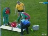 futbolcuyu taşıyan görevliler sedyeyi düşürüyor