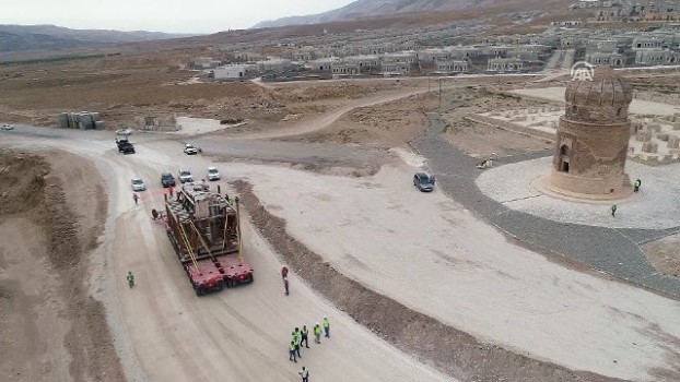 - Hasankeyf Kalesi Orta Kapısı'nın en alt kısmı daimi yerine taşınmasının havadan görüntüsüHasankeyf Kalesi'nin orta kapısının taşınması - Hasankeyf Kalesi'nin orta kapısının, iki bölümünün ardından dün SPMT aracı ile Dicle Nehri üzerindeki köprüden geçirilerek geçici koruma alanına taşınan 130 ton ağırlığındaki üçüncü bölümü Hasankeyf Kültürel Park Alanı'ndaki Arkeopark'ta hazırlanan yeni yerine nakledildi - Kapının üçüncü bölümünün SPMT aracından yeni yerine indirme işlemi 22 Ekim'de gerçekleştirilecekBATMAN (AA) - Devlet Su İşleri (DSİ) Genel Müdürlüğünce, Hasankeyf Kalesi'nin orta kapısının taşınma süreci devam ediyor.Ilısu Barajı HES Projesi Kültürel Varlıkları Koruma Kurtarma Çalışmaları kapsamında Türkiye'de geçen yıl ilk defa uygulanan projeyle, baraj gölü alanından çıkarılan 540 yıllık Zeynel Bey Türbesi, bin 500 ton ağırlığındaki Artuklu Hamamı ve 850 ton ağırlığındaki İmam Abdullah Zaviyesi'nin yeni yerine bütüncül olarak nakledilmesi tamamlandı.Bu kapsamda 1423 yılında Süleyman Han tarafından yaptırılan 400 ton ağırlığındaki Hasankeyf Kalesi'nin orta kapısının, iki bölümünün ardından dün 96 tekerlekli, kendinden tahrikli modüler sistem (SPMT) aracı ile Dicle Nehri üzerindeki köprüden geçirilerek geçici koruma alanına taşınan 130 ton ağırlığındaki üçüncü bölümü de Hasankeyf Kültürel Park Alanı'ndaki Arkeopark'ta hazırlanan 5 kilometre mesafedeki yeni yerine nakledildi.Hasankeyf Kalesi Orta Kapısı'nın geçici koruma alanındaki iki bölümü 22 Ekim'de Hasankeyf Kültürel Park Alanı'ndaki Arkeopark'ta hazırlanan yeni yerine taşınacak. Aynı gün orta kapının üçüncü bölümünün de SPMT aracından yeni yerine indirme işlemi yapılarak, üç bölüm birleştirilmiş olacak.611 yıllık Sultan Süleyman Camisi minaresinin, Hasankeyf Yeni Kültürel Park Alanı'na taşınması için başlatılan çalışma da sürüyor.DSİ 16. Bölge Müdürü Ali Naci Kösalı, Hasankeyf Kalesi Orta Kapısı'nın 130 ton ağırlığındaki üçüncü bölümünün 4 bin 200 metre ilerideki yeni yerine başarıyla taşındığını söyledi.
