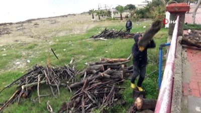 ( ANTALYA ) - Alanya’da etkili olan yağışta plajlar çöplüğe döndü - Ellerine testere ile sahildeki odunlara akın ettiler ANTALYA