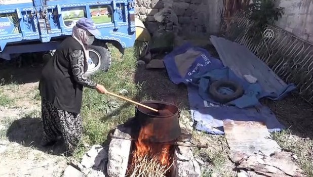 - İpler renklendirme için kazanda 5 saat kaynatılıyorEvinin bir köşesinde bulunan tezgahta kilim dokumanın keyifli olduğunu ve geleneksel yöntemleri kullanarak yıl içinde az sayıda da olsa üretmeye ve geleneği yaşatmaya devam ettiğini anlatan Gül, şunları kaydetti:"Araziden çeşitli kabuk ve bitki topluyoruz. İpi hazırlayınca kazanda yaklaşık 5 saat kaynatıyoruz. Renklerin tutması için kaynayan kazana tuz atıyoruz. Kuruduktan sonra da ipleri yumak halinde sarıp tezgahta kilim dokuyoruz. Çevre illerden kök boya kullandığımızı duyanlar arayıp yaptığım iplerden istiyor ama zahmetli olduğu için vermiyoruz. Oğlum, 'annem zaten zor şartlarda yorularak yapıyor' diyerek vermiyor. Evimize gelen misafirler de dokuma yapmayı görüyorlar. Nasıl yapıldığını bildikten sonra aslında zorluğu yok ama şimdiki gençler böyle uğraşmaz." EbegümeciTeknolojiMuhabirCeviz KabuğuSonbahar